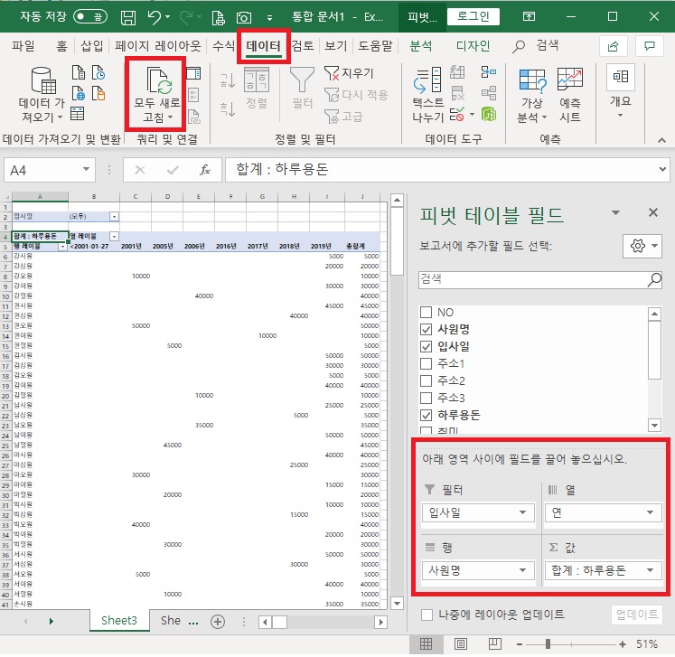 그리고 무엇보다 원본 데이터의 내용을 수정하는 상황이 생겼을 때는 원본 데이터의 내용을 수정하면, 피벗 테이블의 요약된 데이터의 내용에 자동 반영이 바로 되지 않으므로, 새롭게 피벗 테이블을 재생성하거나, 메뉴바에 있는 데이터 탭 ▶ 모두 새로고침 메뉴를 선택하여 수정된 데이터의 내용이 반영될 수 있도록 새로고침 하여 업데이트해주면 편리합니다.