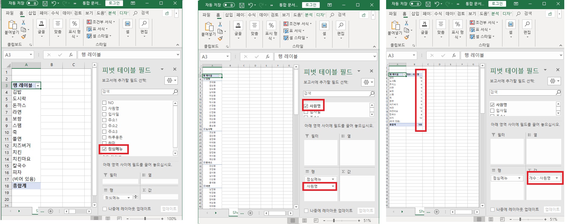 우선 피벗 테이블 필드에서 보고서에 추가할 필드 선택으로 점심 메뉴를 체크해 줍니다.