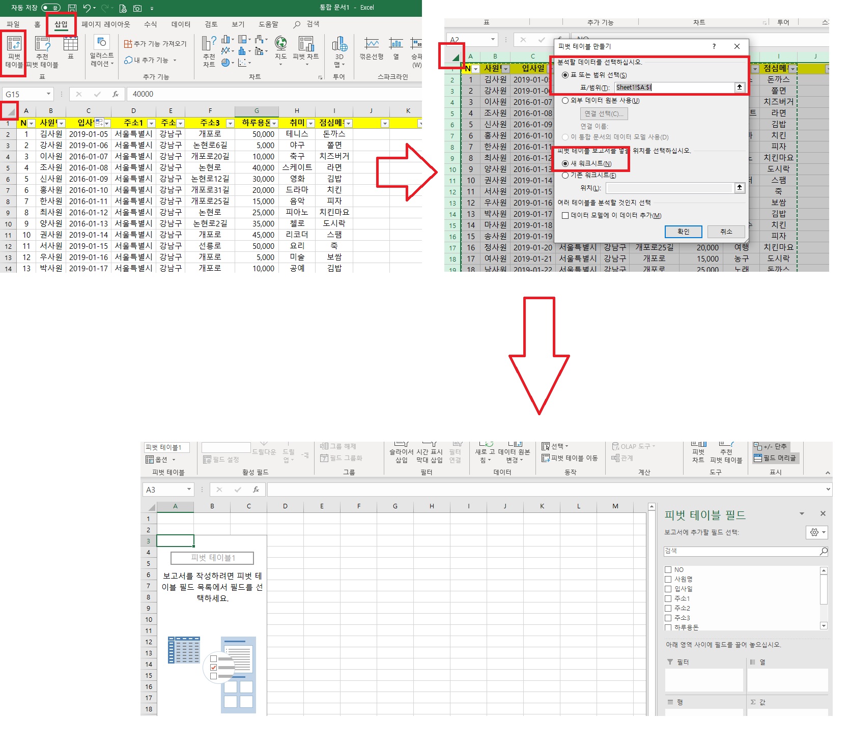 피벗 테이블 만들기 창이 새롭게 활성되는데요. 여기서 보이는 내용은 피벗 테이블로 검토할 데이터의 선택된 범위와, 검토 결과를 볼 수 있도록 원본 데이터는 그대로 유지하되, 새로운 워크시트로 옆 시트에 추가하여 피벗 테이블의 보고서를 볼 수 있도록 확인하는 창입니다. 거의 수정사항은 없지만 내용을 확인하시고 확인 버튼을 눌러주세요.