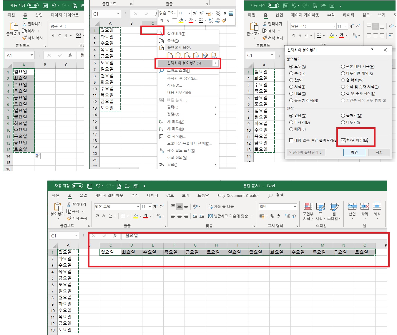 먼저 입력된 셀들(복사할 셀들)을 선택하여 복사를 한 후 붙여 넣기 할 부분을 C1 지점으로 정하였습니다. C1 지점을 선택한 후 오른쪽 마우스를 눌러 선택하여 붙여 넣기를 활성화해 줍니다. 확인 눌러주는 부분 바로 윗부분에 행/열 바꿈을 체크할 수 있는데요. 그 부분을 체크하시고 확인을 눌러주면 C1부터 행/줄 바꿈이 실행되어 세로라인(A열)으로 입력했던 값들을 가로라인(1행)으로 붙여 넣기가 완성되었습니다.
