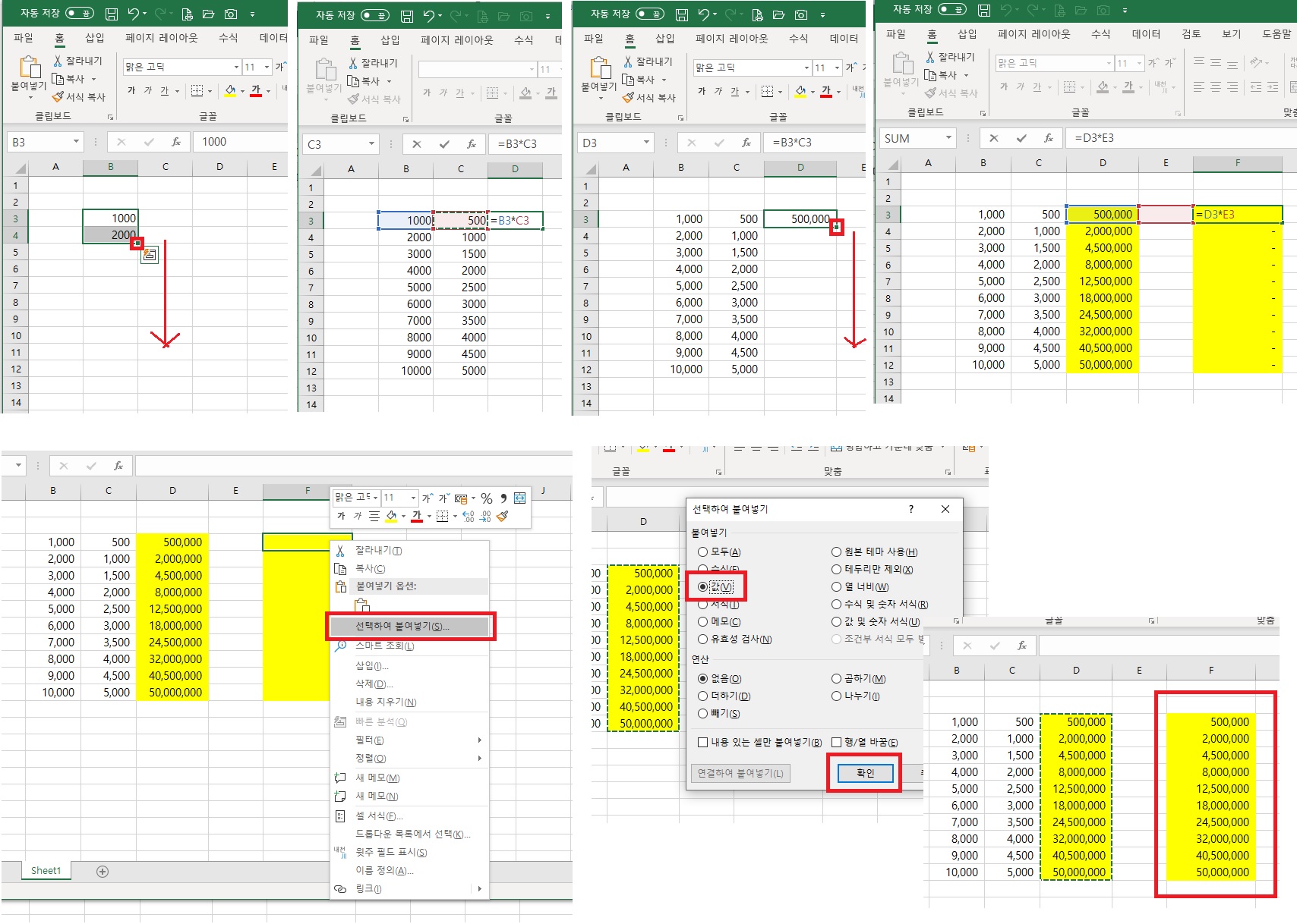 우선 1000, 2000 간단히 입력한 후 입력한 2개의 셀을 선택합니다. 선택하고 나면 오른쪽 아래 작은 점이 보이시지요? 그 점을 누른 상태에서 아래로 쭉 드래그해 봅니다. 1000, 2000, 3000, 4000... 이런 식으로 자동 입력이 된 모습이 보입니다. 선택한 셀인 1000과 2000의 셀 규칙이 자동완성으로 인식되어 1000의 차이만큼 아래 셀에 자동으로 입력된 것입니다. 만약 1,2,3을 입력한 후 1,2,3을 선택하여 드래그하면 1,2,3,4,5,6,7,8 등...으로 표시되고, 가, 나, 다 등이나, 월, 화, 수, 목 등 자동 입력이 가능하니 알아두시면 편리합니다. 오른쪽에도 마찬가지로 500,1000 까지만 입력한 후 2개의 셀을 함께 선택한 후 왼쪽 열과 마찬가지로 작은 점을 잡고 드래그해보겠습니다. 셀 수식을 입력하기 위해, D열에는 B열과 C열의 곱하기 값을 입력할 텐데요. 입력방식은 "=B3*C3" 입력해주시거나, "=셀 선택(B3)*(곱하기) 셀 선택(C3)"으로 해두시고 엔터를 쳐줍니다. 500,000원이 자동 계산되어 나타났네요. 500,000으로 자동 계산된 셀도 마찬가지로 작은 점을 잡고 드래그하여 내려주거나, 작은 점을 더블클릭하여도 자동 계산되어 채워지는 모습을 보실 수 있습니다. 이처럼 엑셀은 자동계산 기능이 스스로 인식되고 있는 듯하네요. 만약 이 D열 계산식을 복사하여 F열에 그냥 Ctrl+V로 붙여 넣어 봅시다. 수식만 복사가 되어 D열과 E열로 곱하겠다는 수식만 복사되었기 때문에 값이 나타나지 않게 되는 겁니다.