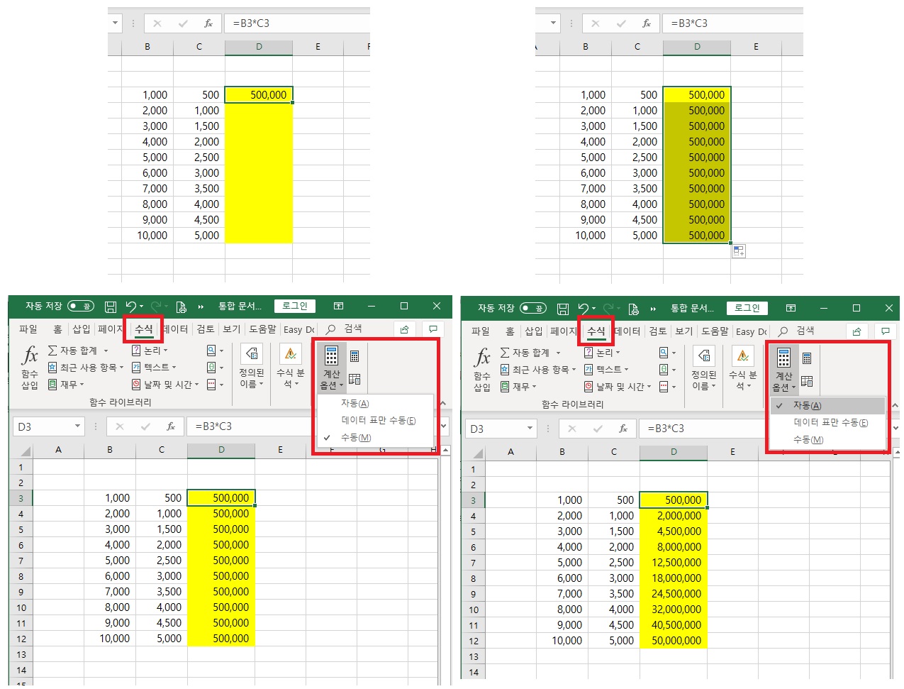 화면에서는 자동계산이 안 되는 경우를 말씀드리기 위해, 자동계산이 되지 않고 있는 상황이 보이는데요.