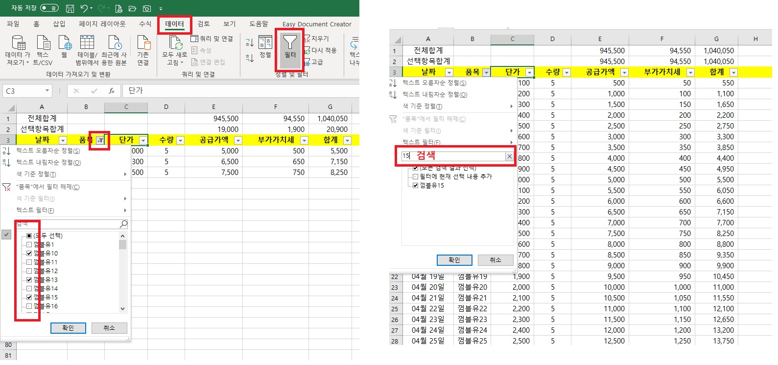품목의 자동 필터를 누르고 (모두 선택) 된 부분을 전체 체크 해제하신 후 원하는 내용만 쏙쏙 선택한 상태에서 확인을 눌러봅니다. 선택한 필터 값의 합계만 집계된 금액이 확인되시나요?