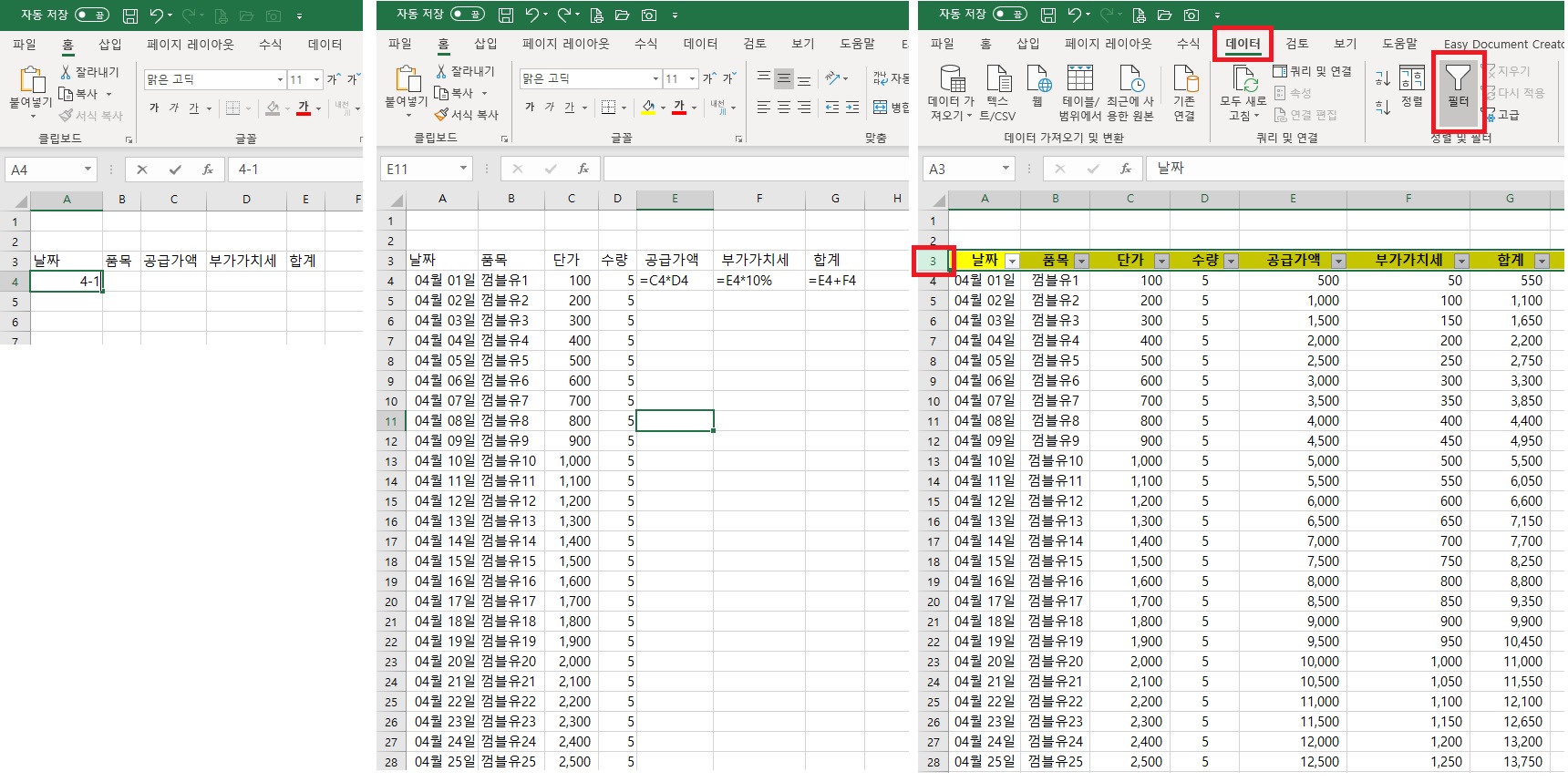 시작은 A3의 셀부터 제목들을 쭉 입력해두고 날짜가 들어가는 셀에는 간단히 4-1을 입력하고 엔터를 쳐서 04월 01일을 입력한 후 쭉 드래그하여 방대한 양을 만들었습니다. 일반 업무내용과 비슷하게 보이기 위해 단가, 수량, 공급가액, 부가가치세, 합계 등을 입력하였으며, 수식도 걸어두었습니다.