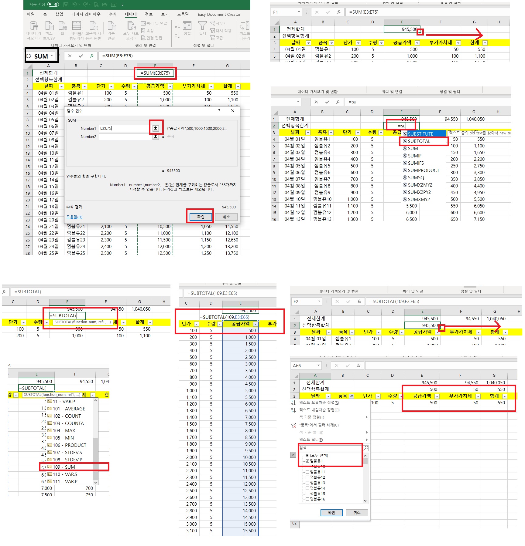 Function의 값을 숨긴 내용을 제외하여 보이는 내용만 계산되도록 109 - SUM을 선택하였으며, 활용도에 따라 숨긴 내용을 모두 포함하여 계산하고 싶으실 경우에는 9 - SUM을 선택하여 계산하시면 편리하답니다.