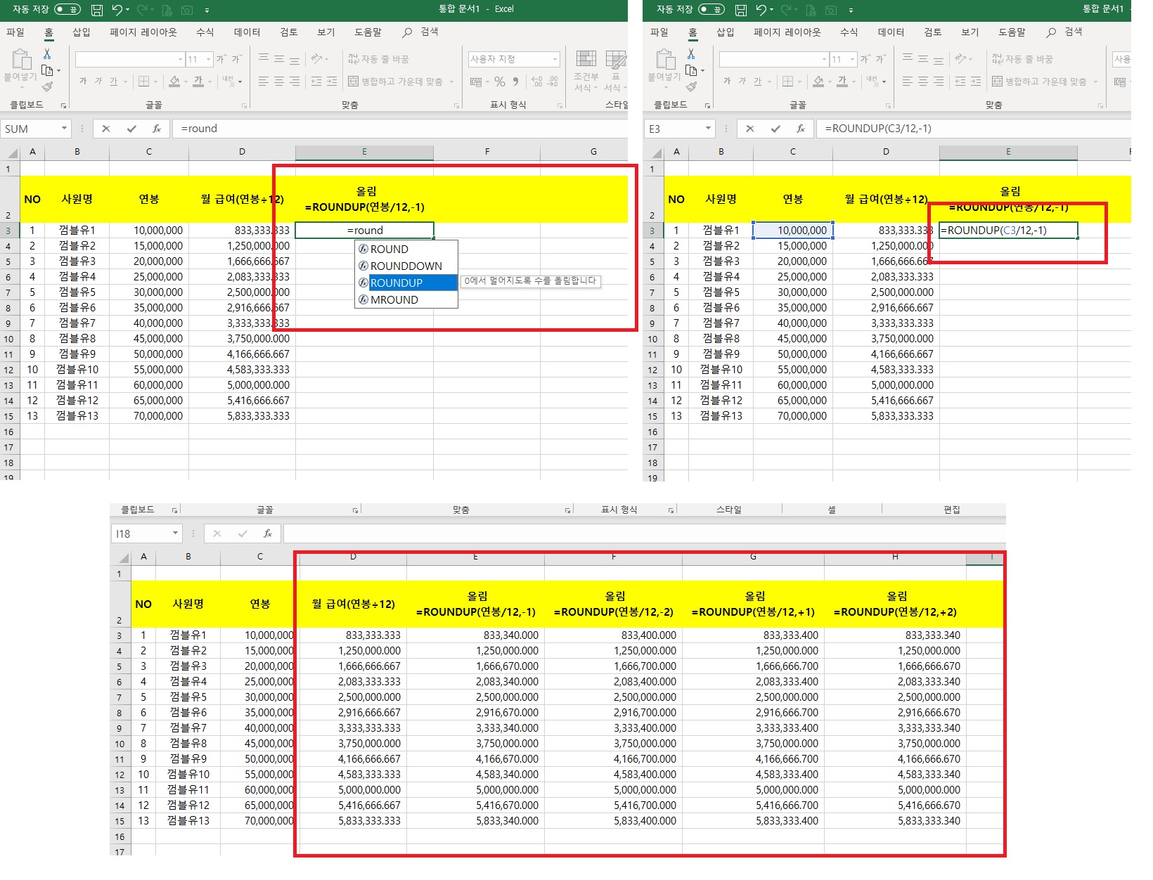 ROUNDUP 함수는 무조건 올림을 해 줄 수 있는 함수로써, 함수를 이용한 수식은 "=ROUNDUP(number, num_digits)"으로 입력됩니다. 이 올림 함수인 ROUNDUP 함수는 제가 실무에서도 퇴직연금 금액을 계산할 때 꼭꼭 쓰는 함수이기도 합니다. 퇴직연금 같은 경우 월 급여에 12를 나누어 매월 적립하는 제도인데요, 반올림을 하거나 내림을 하는 회사도 물론 있지만, 올림 함수를 써 주는 게 소소하지만 직원들에게 제일 좋아 보이기 때문에 개인적으로 저는 ROUNDUP 올림 함수로 계산을 합니다. 그럼 입력을 위해 아래 첨부 사진과 같이 F2 편집 단축키를 누르시고 =ROUNDUP을 직접 입력하셔도 되고, ROUND까지만 입력하시면 ROUND 입력 때처럼 옆에 자동완성창이 활성화되니 ROUNDUP 함수를 더블클릭해줍니다. 마찬가지로 연봉의 금액이 들어간 셀을 클릭하신 후 나누기 12 (/12)를 입력하신 후 콤마 (,)를 입력해 주신 후 올림 해줄 자릿수를 입력해주신 후 괄호를 닫고 엔터를 칩니다. ROUND 입력과 마찬가지인 올림 자릿수를 입력해 주어야 하는데요, 자릿수는 원단위는 -1, 백 원 단위는 -2, 천 원 단위는 -3 등으로, +1, +2, +3 등은 보이는 소수점 자리 가지의 올림이라고 생각하시면 됩니다. 아래 첨부 사진 내용에는 -1, -2, +1, +2의 자릿수 올림으로 계산을 해 보았습니다. - 단위는 숫자만큼 뒤에 0이 된다고 생각하시면 되고, + 단위는 소수점 단위의 숫자만큼만 보인다고 생각하시면 되겠습니다. 제일 쉽게는 그냥 입력해 보는 것도 괜찮습니다.
