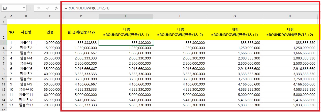 ROUND 함수는 반올림을 해 줄 수 있는 함수로써, 예시를 들어 설명드리기 위해 연봉을 12개월로 나누어 월 급여를 계산해 보았습니다. 연봉은 10,000,000원부터 70,000,000원 까지 5백만 원씩의 단위로 해두고 월 급여를 계산하기 위해 12개월로 나누어보았습니다. 수식을 넣어 계산한 금액이다 보니, 보이지는 않지만 소수점 단위까지 계산되었을 거라 생각됩니다. ROUND 함수를 사용한 금액과 원래 계산된 금액을 비교하기 위해 옆 열에 작업을 하였습니다.