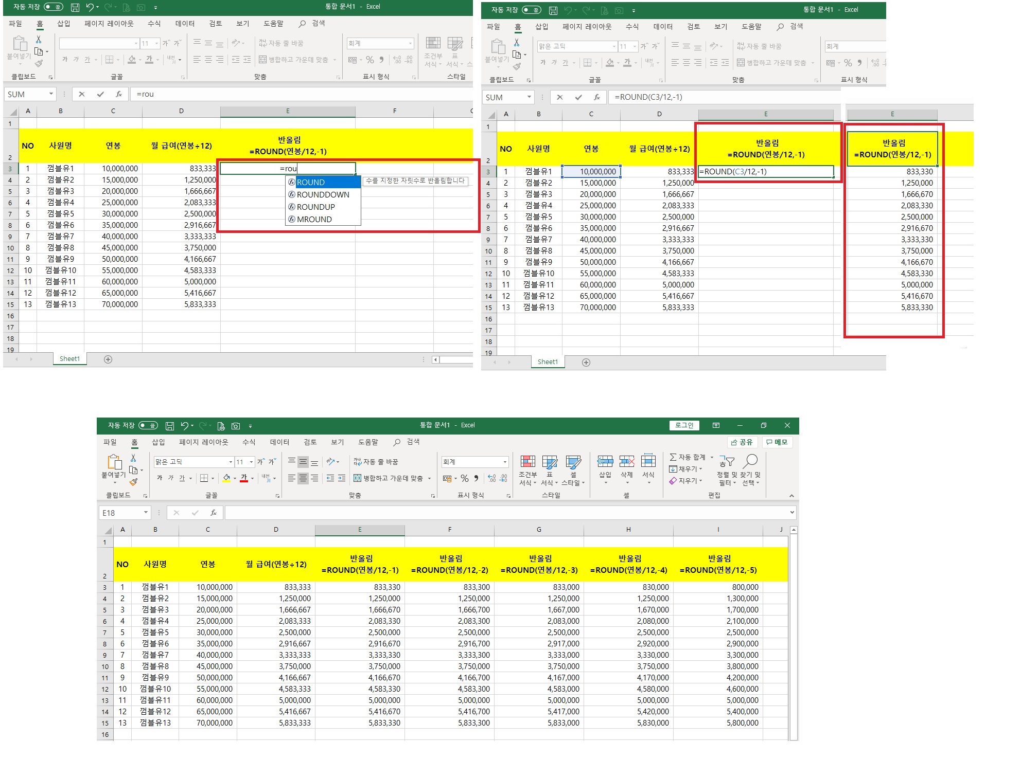함수를 이용한 수식은 "=ROUND(number, num_digits)"로 입력되며, 아래 첨부 사진과 같이 F2 편집 키를 누르고 =ROUND를 직접 입력하셔도 되고, RO까지만 입력하셔도 옆에 자동완성창이 활성화되어 ROUND 함수를 더블클릭해줍니다. 그다음 연봉의 금액이 들어간 셀을 클릭하신 후 나누기 12 (/12)를 입력하신 후 콤마 (,)를 입력해 주신 후 반올림해줄 자릿수를 입력해주시고 괄호를 닫은 후 엔터를 치면 끝이 납니다.
