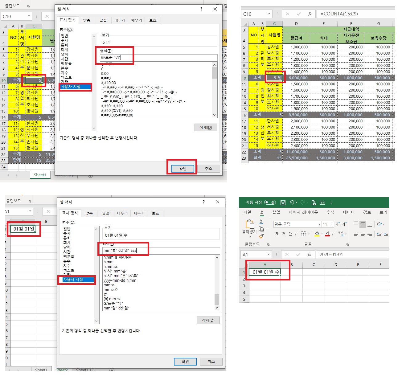 10. 사용자 지정 : 기존의 형식 중 하나를 선택하여 형식을 변형시킬 수도 있고, 원하는 스타일로 표시 형식을 만들어서 입력 추가가 가능합니다. 사용자 지정의 활용 예시를 아래 첨부 사진과 같이 2가지를 들었습니다. 수식의 계산이 완료된 후 숫자로만 나타난 값을 셀 서식 ▶ 표시 형식 ▶ 사용자 지정을 일반 표시 형식 인 G/표준 "명"으로 계산된 값 뒤에 명이라는 텍스트를 추가하겠다는 설정을 하였습니다. 아래 설정은 1-1로 기본 입력된 01월 01일 뒤에 요일을 간단히 붙여 표시할 수 있도록 설정하였으며, 참고로 aaa는 수 aaaa는 수요일로 표시가 되니 원하는 스타일로 사용자 지정으로 설정 편집이 가능하니 활용하시면 편리합니다.