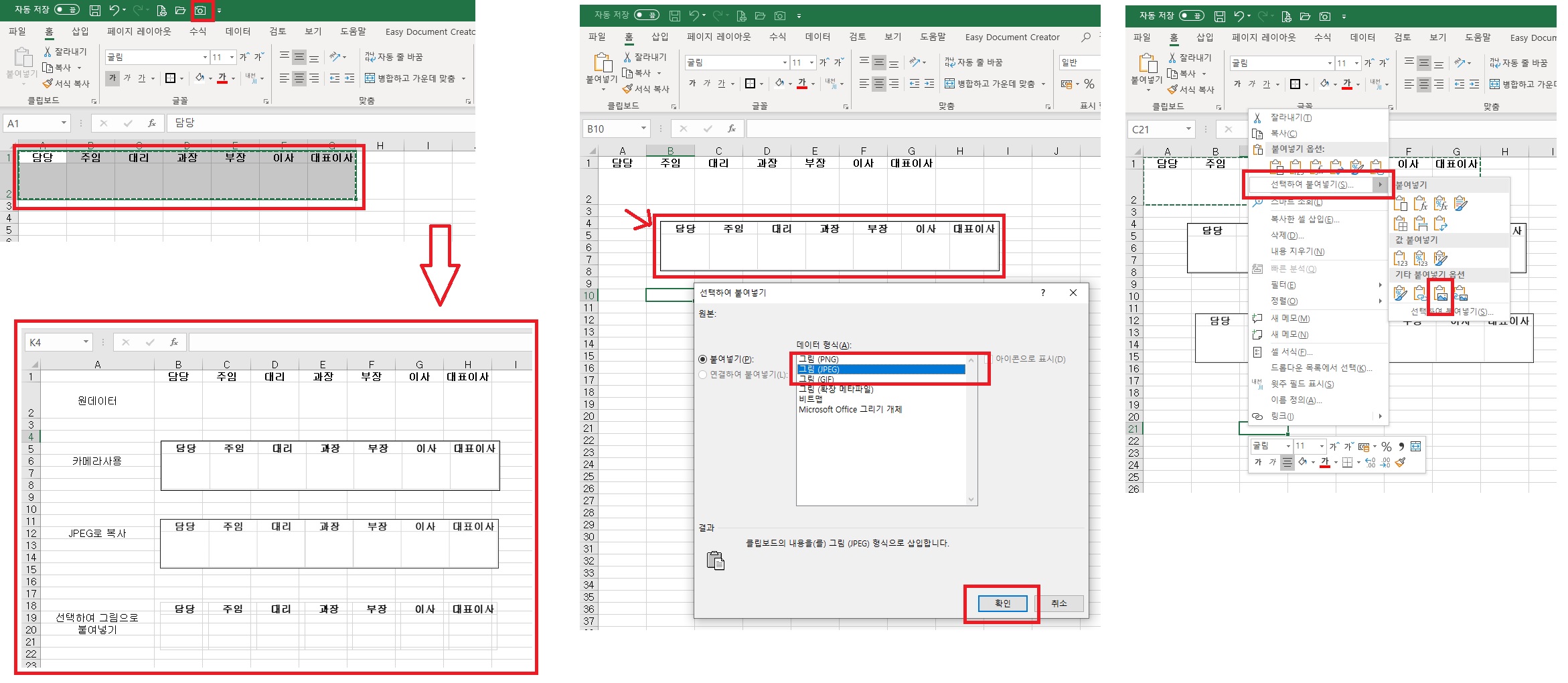 결재란은 02. 자금 일보 양식(서식) 만들기 포스팅에서 그림으로 붙여 넣기 하는 방법으로 다루었었는데요. 다시 한번 설명드리면서 카메라 기능을 이용하여 만드는 법도 간단히 알려드리겠습니다. 먼저 결재란에 들어갈 담당 및 직급 등을 1행에 입력하고 2행에는 싸인이 들어갈 수 있게끔 1:3 비율 정도로 행 너비를 조절하여 만들어 줍니다. 결재란 부분을 드래그하여 선택한 후 카메라를 선택하고 빈 공간에 왼쪽에서 오른쪽 아래로 대각선 드래그하여 캡처를 해줍니다. 이는 범위 설정으로 만들어진 캡처 내용이라, 원본 데이터를 캡처 범위 내에서 수정할 경우 함께 수정되는 카메라 본이므로, 수정이 불가능하게 만들어 주기 위해서는 카메라 본을 복사(Ctrl+C) 한 후 빈 셀에 오른쪽 마우스를 눌러 JPEG 파일로 선택하여 붙여 넣기 해줍니다. 두 번째는 먼저 설명드렸던 대로 원본 데이터를 복사(Ctrl+C) 한 후 빈 셀에 오른쪽 마우스를 눌러 선택하여 붙여 넣기 ▶ 그림으로 붙여 넣기를 해줍니다. 후자의 방법이 번지는 느낌 없이 자연스럽게 붙여 넣기 되므로 지출결의서 양식에 사용될 결재란은 그림으로 붙여 넣기로 붙여주겠습니다. 아래 예시 사진에는 없지만 담당 왼쪽에 결재라고 세로 텍스트로 병합하여 만들어주면 좋습니다.