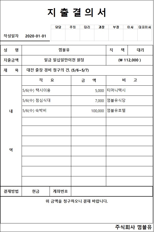 오늘은 다양한 방법으로 결재란을 만들고, 아래 첨부 사진과 같이 지출결의서 양식(서식)을 만드는 과정을 포스팅하겠습니다.