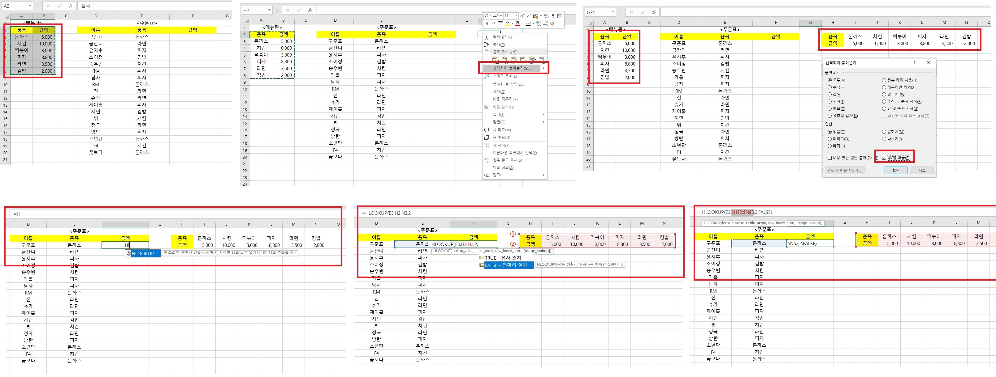 HLOOKUP 함수는 VLOOKUP 함수와 기능이 비슷한 함수로 메뉴판처럼 위에서 아래로 쓰여있는 범위를 가지고 수식을 만드는 VLOOKUP함수가 있고, 왼쪽에서 오른쪽으로 입력되어있는 범위를 가지고 수식을 만들 수 있는 함수는 HLOOKUP 함수를 이용합니다. HLOOKUP함수 사용 예제를 만들기 위해 위에서 아래로 되어있는 메뉴판의 범위를 복사하여 오른쪽 붙여 넣기 할 비어있는 셀을 선택한 후 선택하여 붙여 넣기를 이용하여, 행/열 바꿈을 선택한 후 가로 형식의 메뉴판을 만들었습니다. 이처럼 HLOOKUP함수는 가로 형식의 범위를 이용하여 수식을 입력합니다.