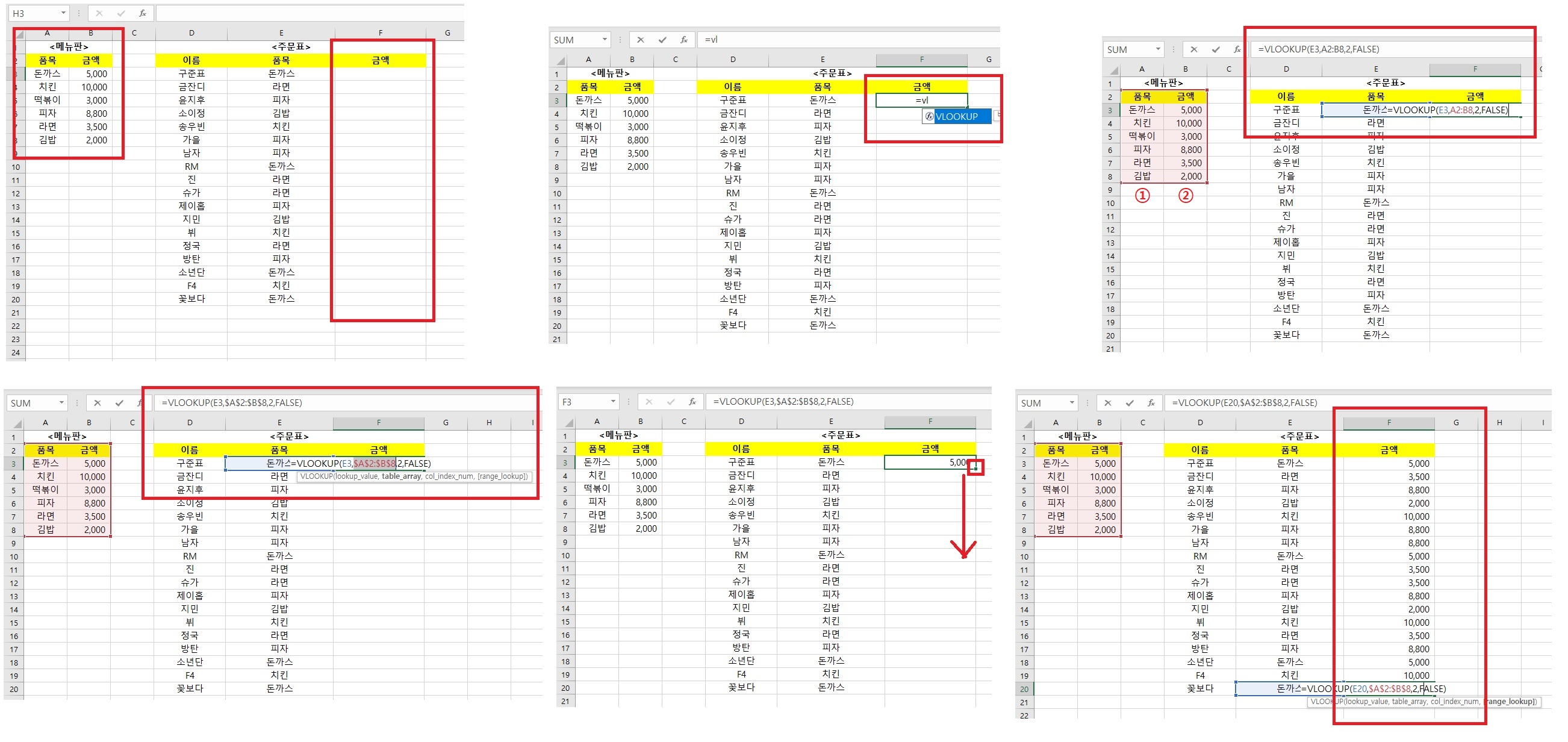 VLOOKUP 함수를 사용하기 위해 아래 첨부사진을 보시면, 메뉴판이라는 품목과 단가 금액 표를 만들고, 옆 열에 주문표를 작성하였습니다. 주문표 안에 들어갈 금액을 넣기 위해 VLOOKUP 함수를 이용하여 품목에 맞는 금액을 넣어보겠습니다. 입력방식은 =VLOOKUP(lookup_value, table_array, col_index_num, [range_lookup])으로 찾아줄 값, 찾을 값이 들어있는 전체의 범위, 들어갈 값이 들어있는 열의 순번이라고 생각하시면 됩니다. 먼저, 금액 열에 들어갈 셀 안에 수식을 입력하기 위해 F2 편집 단축키를 누르고, "=" 입력 후 VLOOKUP(으로 직접 입력 또는 VL까지만 입력 후 자동완성창에서 함수를 더블클릭하여 선택해줍니다. 찾아줄 품목 E3의 돈가스 셀을 선택하고 콤마(,), 이 돈가스 등의 단가가 들어간 메뉴판 전체를 드래그하여 범위를 선택하고 콤마(,), 메뉴판의 품목 열을 1열, 금액 열을 2 열이라고 생각하고 금액을 넣어야 하므로 금액 열인 숫자 2를 입력 후 콤마(,), 정확하게 일치하는 값을 넣기 위해 FALSE라고 직접 입력 또는 자동완성창에서 더블클릭하여 선택한 후 괄호를 닫고 엔터를 칩니다. 이때 수식을 복사하여 아래로 끌 경우 범위가 달라지기 때문에 메뉴판의 범위인 A2:B8을 드래그하여 선택한 후 F4 고정 단축키를 눌러 $A$2:$B$8 가 되도록 범위를 고정하여 수식을 완성합니다. 완성된 수식이 입력된 셀을 선택하고 작은 점을 잡고 드래그하여 복사하거나 더블클릭하여 수식을 채워주면 각각의 품목의 맞는 금액을 메뉴판의 범위 안에서 찾아 금액이 알맞게 들어간 부분을 확인할 수 있습니다.