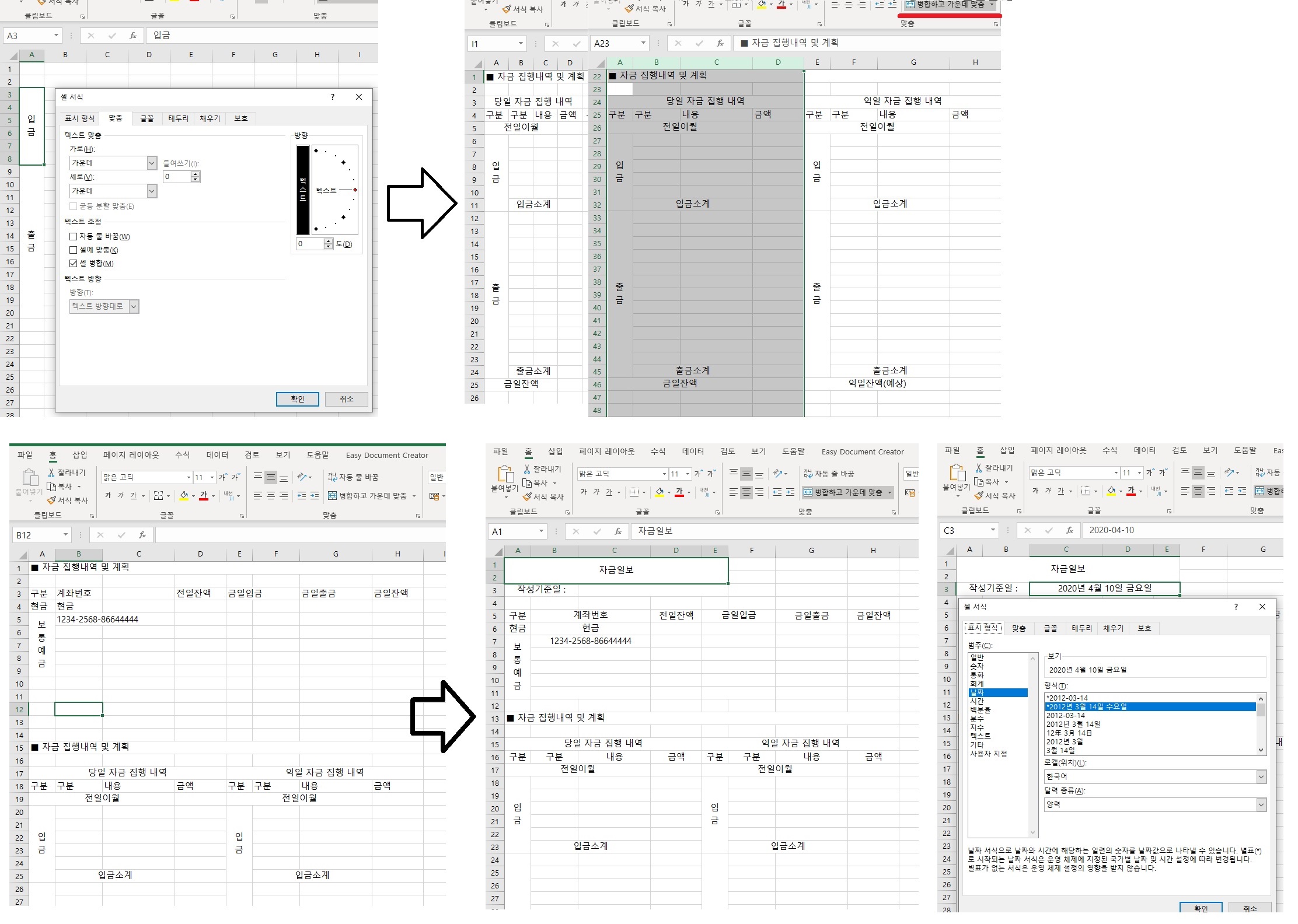 자금 일보 양식을 먼저 머릿속에 그려보고 엑셀을 연 다음 필요한 내용과 꼭 들어가야 될 내용들을 툭툭 셀에 넣어보세요.
