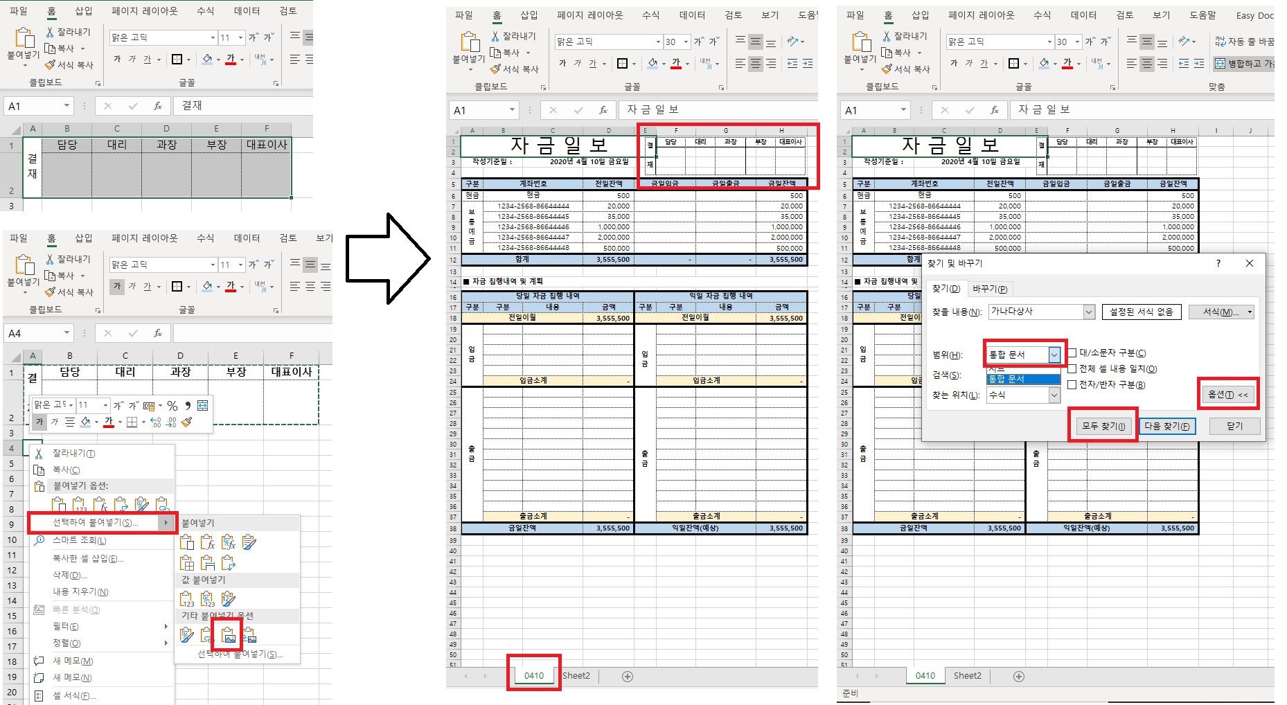 회계 프로그램을 쓰면 물론 데이터 찾기가 훨씬 빠르시겠지만, 안 쓰는 회사이다 보면 데이터 찾기가 너무 힘드실 거예요. 그래서 방법을 알려드리겠습니다. 예시를 들어서 가나다 상사에 우리 회사가 언제 언제 돈을 주고 했는지 찾아보겠습니다. 우선 자금 일보는 2020년도, 2021년도 식으로 연도별로 1개씩 파일은 만들어 관리하시되, 시트는 하루하루 만들어 주시면 관리하시기 훨씬 수월하십니다. 그렇게 되면 2020년도에 가나다 상사를 검색해볼 때 Ctrl + F라는 찾기 단축키를 눌러보시면, 옵션 부분을 활성화시켜 통합 문서로 선택하고 가나다 상사를 입력 후 모두 찾기를 눌러주시면 가나다 상사가 입력된 시트 명이 모두 나오면서 자료를 빠르게 검토해 볼 수 있답니다. 가나다 만 입력하여 찾아도 나올 수 있겠네요.